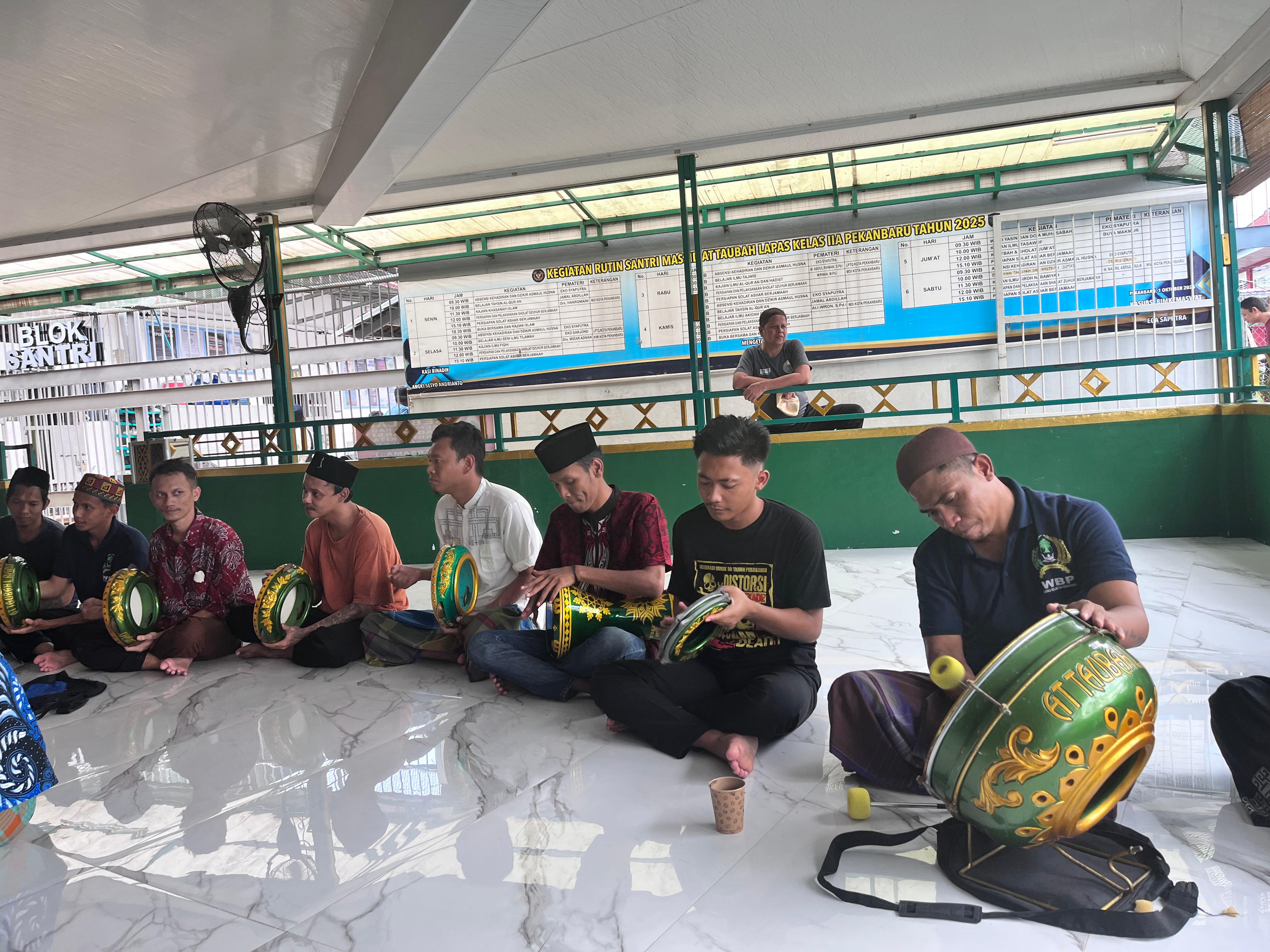 Pekanbaru,sahabatadhyaka.com—INFO_PAS – Masjid At-Taubah Lembaga Pemasyarakatan (Lapas) Kelas IIA Pekanbaru tampak ramai dan riuh alunan merdu Marawis. Masing-masing warga binaan yang duduk bersila memegang alat musik yang terbuat dari kayu dan kulit lembu itu. Ada juga yang memainkan simbal dan salah seorang menjadi vokalis dalam grup marawis itu. Hari ini memang tengah dilakukan latihan Marawis oleh Warga Binaan Pemasyarakatan (WBP) Lapas Pekanbaru. Kegiatan latihan Marawis dilatih oleh Instruktur professional dan dilaksanakan dua kali dalam seminggu di Masjid At-Taubah Lapas Kelas IIA Pekanbaru, Kamis (29/01/2026).