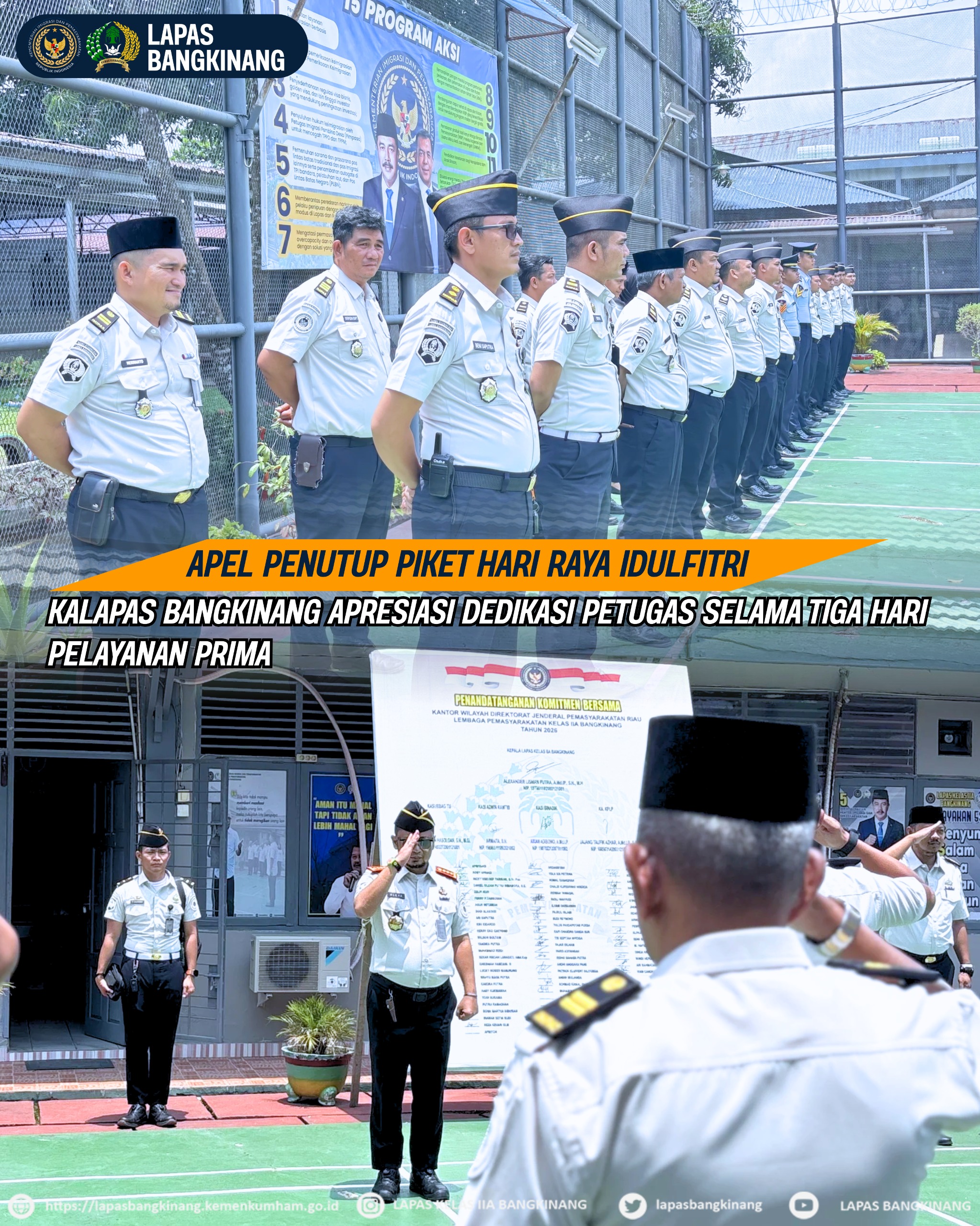 INFO_PAS BANGKINANG,sahabatadhyaksa.com— Lembaga Pemasyarakatan (Lapas) Kelas IIA Bangkinang melaksanakan apel penutup piket Hari Raya Idulfitri setelah rangkaian pelayanan kunjungan yang berlangsung selama tiga hari berjalan dengan aman, tertib, dan lancar. Kegiatan apel ini menjadi momentum evaluasi sekaligus bentuk apresiasi atas dedikasi seluruh jajaran petugas dalam memberikan pelayanan terbaik kepada masyarakat, Senin (23/03/2026).