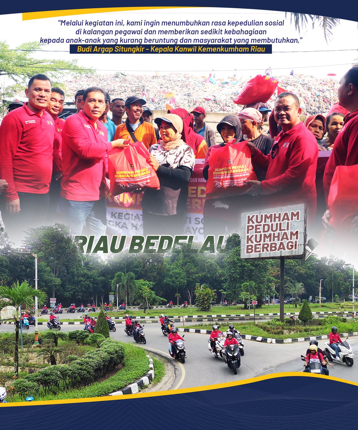 Rombongan touring yang terdiri dari Kepala Kantor Wilayah Kementerian Hukum dan HAM Riau Budi Argap Situngkir, Kepala Divisi Administrasi Johan Manurung, Kepala Divisi Pelayanan Hukum dan HAM Edison Manik, dan Kepala UPT se-Pekanbaru beserta jajaran berangkat dari Kanwil Kemenkumham Riau mengunjungi tiga titik yakni Panti Asuhan Al-Fajar, Panti Asuhan Bethesda dan Tempat Pembuangan Akhir (TPA) di Muara Fajar Rumbai.