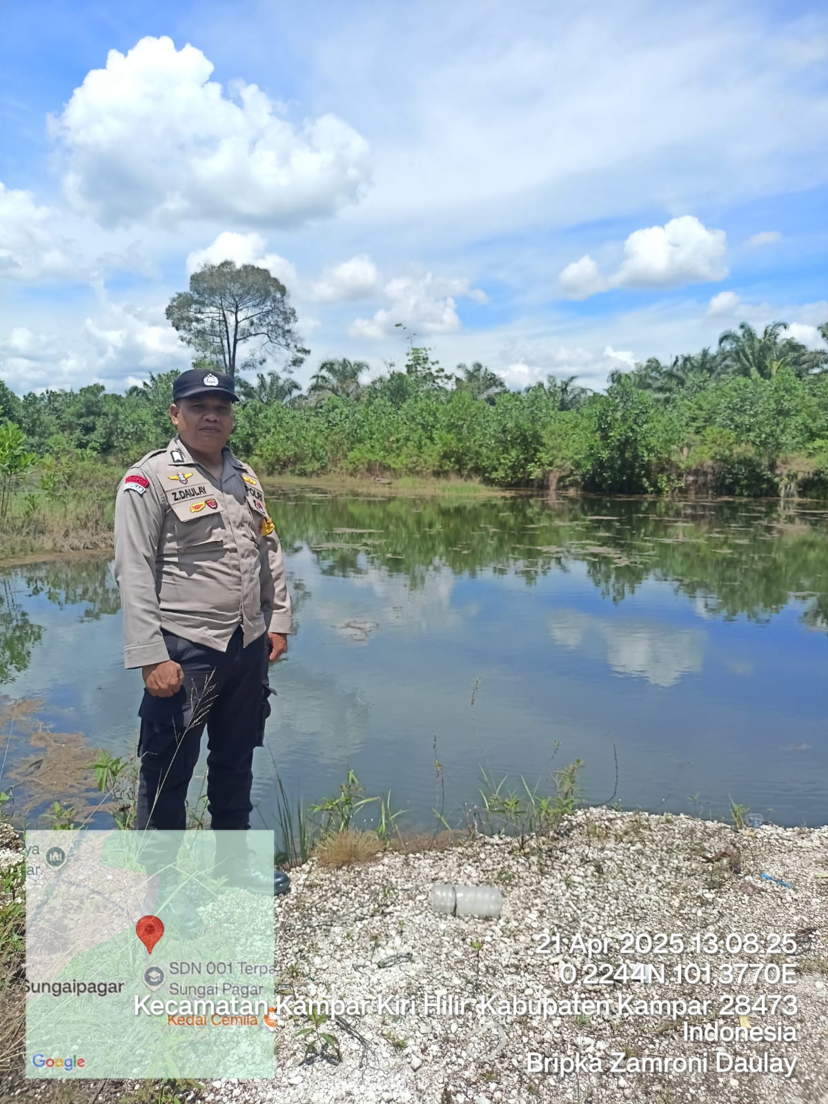 Kampar Kiri Hilir,sahabatadhyaksa.com- Bhabinkamtibmas Kelurahan Sungai Pagar, Bripka Zamroni Daulay, bersama Danpos Ramil Kecamatan Kampar Kiri Hilir, Peltu Rudi M. Tanjung, terus berupaya mencegah terjadinya kebakaran hutan dan lahan (karhutla) di wilayahnya. Pada Senin (20/04/2025) sekira pukul 13.00 WIB, Bripka Zamroni melakukan pengecekan embung di dua lokasi di Kelurahan Sungai Pagar serta menjalin sambang dengan warga dan mensosialisasikan tentang larangan membakar hutan dan lahan.
