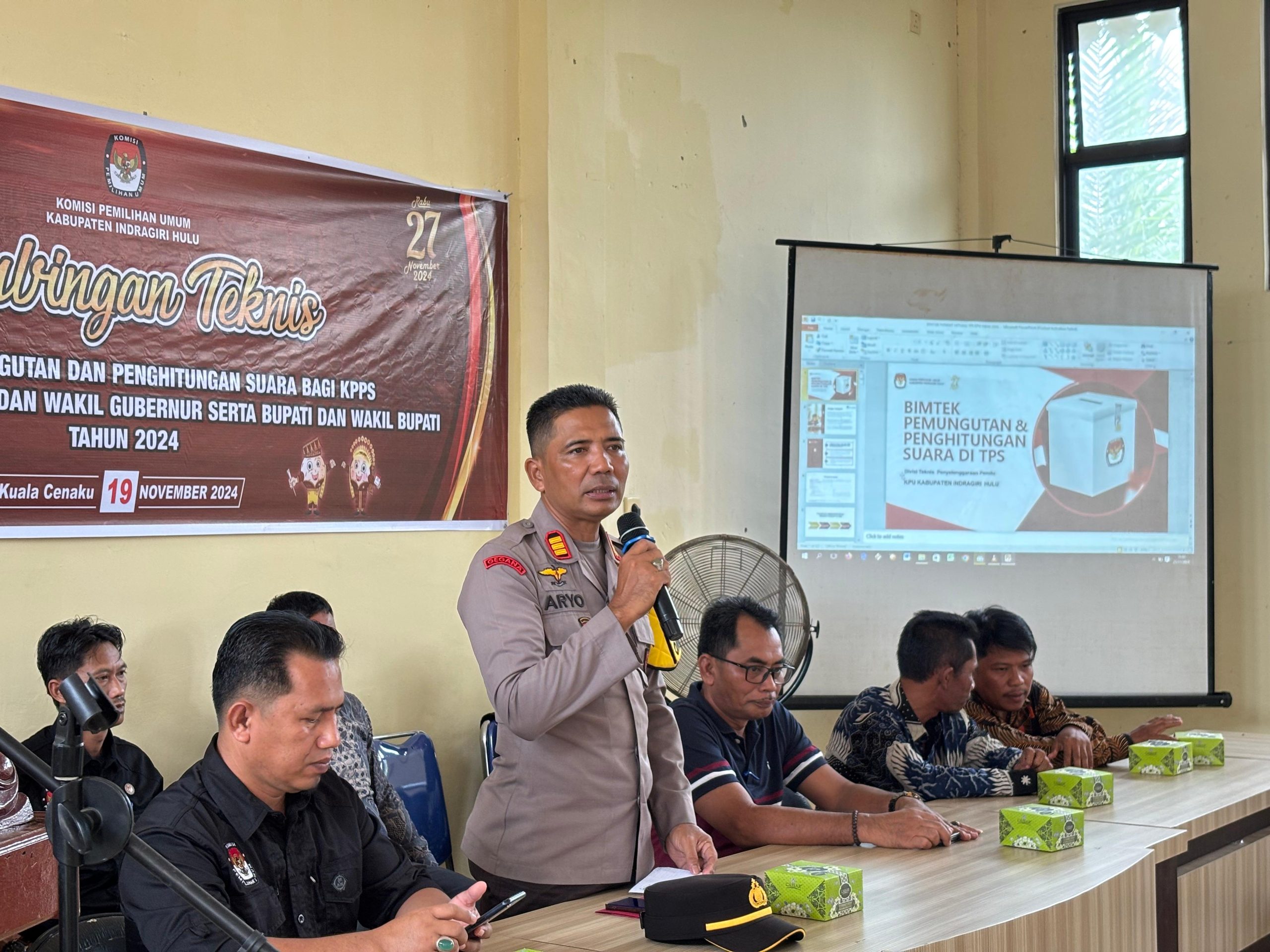 Kapolsek Kuala Cenaku, AKP Sunaryo, dalam sambutannya mengingatkan para petugas KPPS untuk menjaga integritas dan netralitas selama proses pemungutan dan penghitungan suara.