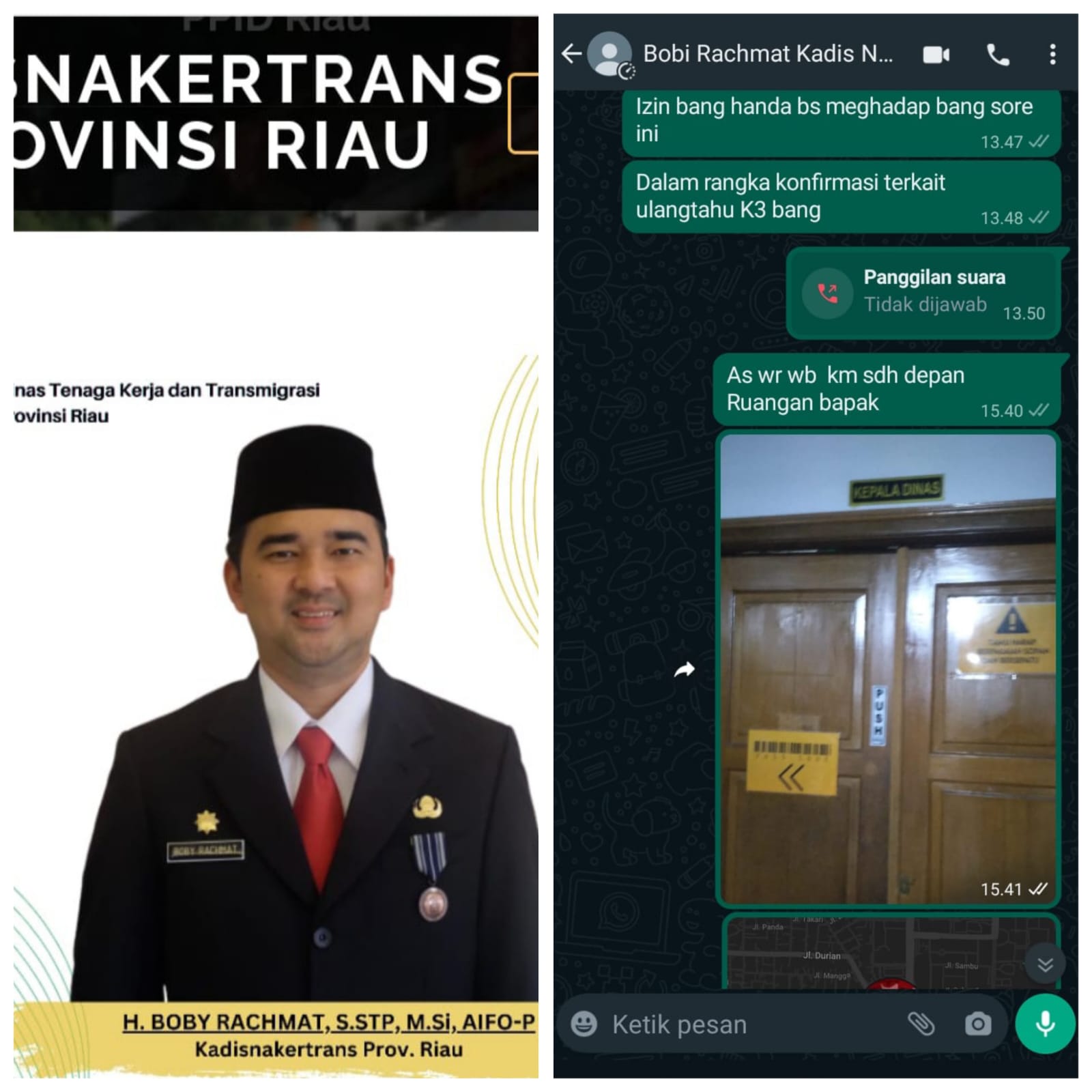 Terkait peringatan Bulanan Keselamatan dan Kesehatan Kerja (K3) Tahun 2024, awak media mencoba datangi dan meminta tanggapan Kepala Dinas Tenaga Kerja dan Transmigrasi Provinsi Riau Boby Rachmat dikantornya, namun seribu kali sayang, kadis tidak bisa dijumpai dengan alasan rapat, dari Rabu (7/2) pukul 15.00 sampai pukul 17.00 wib kemarin.