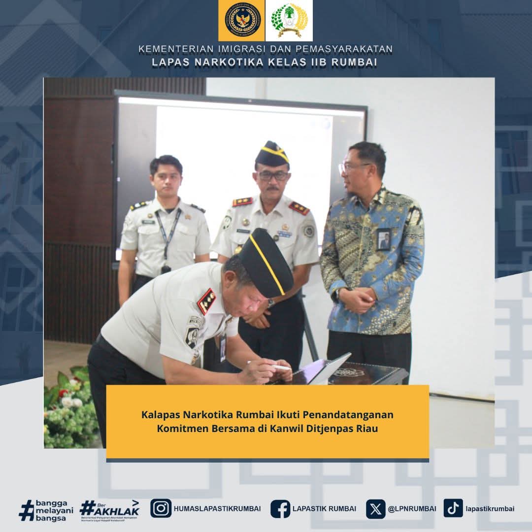 Penandatanganan komitmen bersama tersebut ditandatangani oleh Kepala Kantor Wilayah Direktorat Jenderal Pemasyarakatan Riau, Maizar, serta diikuti oleh seluruh Kepala UPT Pemasyarakatan se-Riau, sebagai simbol komitmen bersama dalam mendukung pembangunan Zona Integritas menuju Wilayah Bebas dari Korupsi (WBK) dan Wilayah Birokrasi Bersih dan Melayani (WBBM).