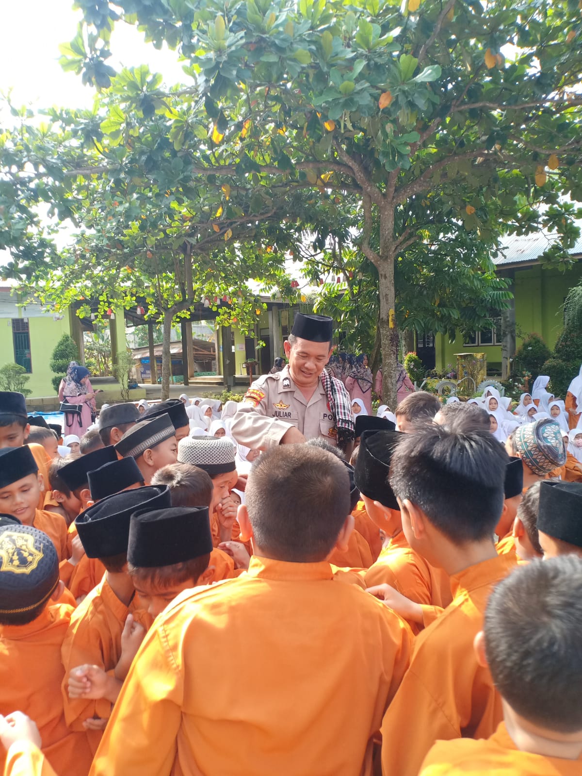 Selain tausiyah, kegiatan dilaksanakan Jumat, 22 Maret 2024 pagi tersebut, juga dalam rangka memotivasi dan membawa pesan-pesan Kamtibmas pada ratusan pelajar MI Al-Firdausy.