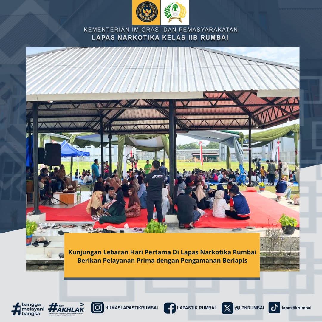 Pekanbaru,sahabatadhyaksa.com – Suasana penuh keharuan dan sukacita menyelimuti Lembaga Pemasyarakatan Narkotika Kelas IIB Rumbai pada Sabtu, 21 Maret. Memasuki hari pertama Idul Fitri, ratusan pengunjung mulai berdatangan memadati area lapangan utama untuk melepas rindu dan bersilaturahmi dengan warga binaan. Menghadapi lonjakan kunjungan tersebut, seluruh jajaran petugas telah bersiap siaga sepenuhnya guna memberikan pelayanan prima kepada masyarakat.
