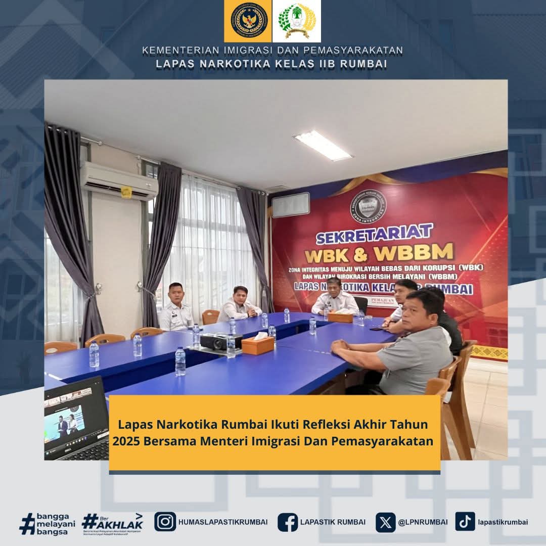 Pekanbaru,sahabatadhyaksaksa.com – Lembaga Pemasyarakatan (Lapas) Narkotika Kelas IIB Rumbai mengikuti kegiatan Refleksi Akhir Tahun Kementerian Imigrasi dan Pemasyarakatan (Kemenimipas) yang diselenggarakan secara virtual pada akhir Desember 2025. Kegiatan ini diikuti oleh seluruh jajaran Unit Pelaksana Teknis (UPT) Imigrasi dan Pemasyarakatan se-Indonesia sebagai momentum evaluasi capaian kinerja sepanjang tahun 2025 serta peneguhan komitmen peningkatan pelayanan publik ke depan. Senin (29/12).