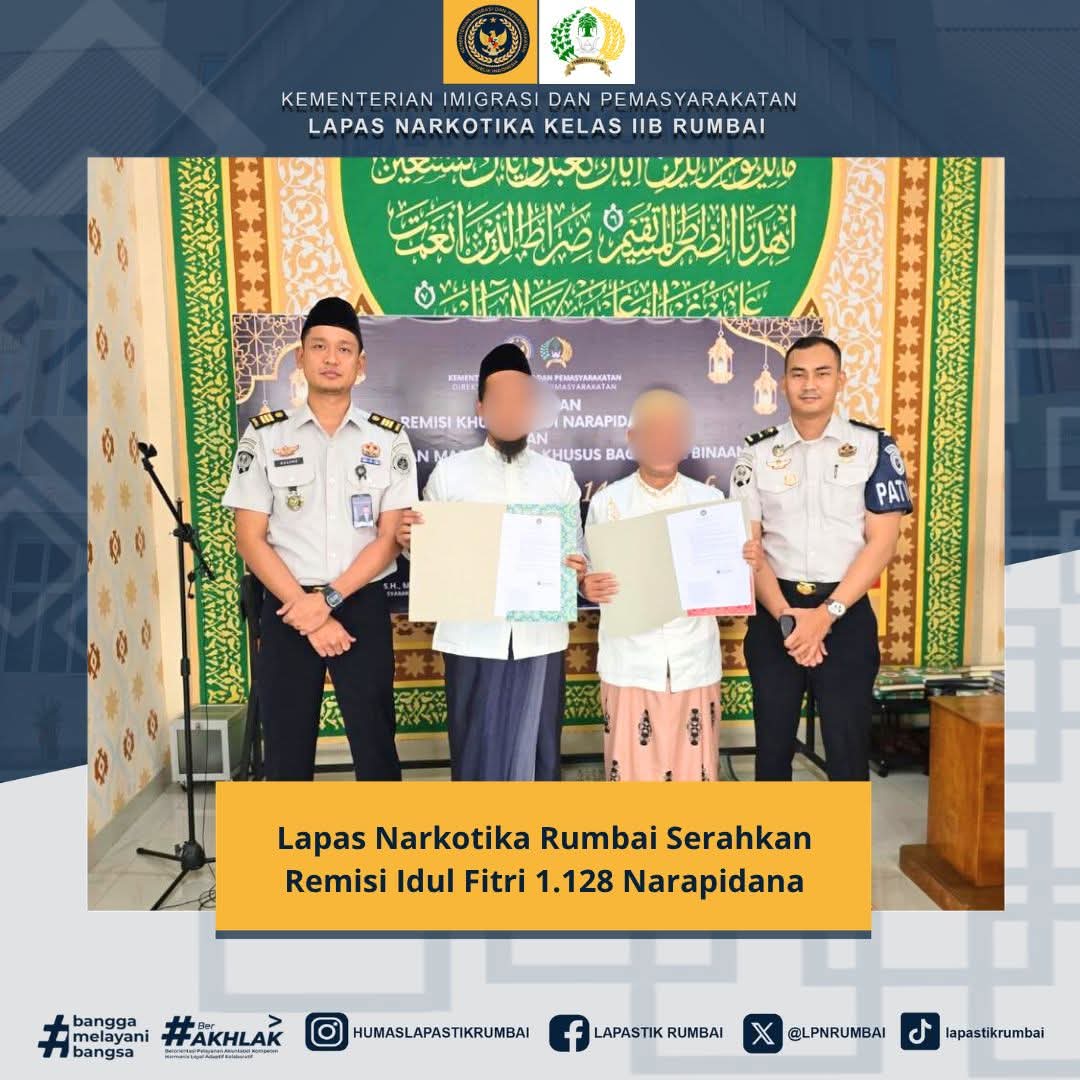 Pekanbaru,sahabatadhyaksa.com- Sebanyak 1.128 warga binaan di Lembaga Pemasyarakatan Narkotika Kelas IIB Rumbai mendapatkan remisi atau pengurangan masa hukuman pada Hari Raya Idul Fitri 1447 Hijriah.