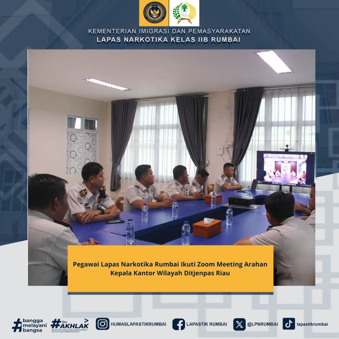 Melalui kegiatan Zoom Meeting ini, diharapkan seluruh pegawai Lapas Narkotika Rumbai dapat memahami dan mengimplementasikan arahan pimpinan dalam pelaksanaan tugas sehari-hari, sehingga mampu mewujudkan penyelenggaraan pemasyarakatan yang profesional, akuntabel, dan berorientasi pada pelayanan publik.