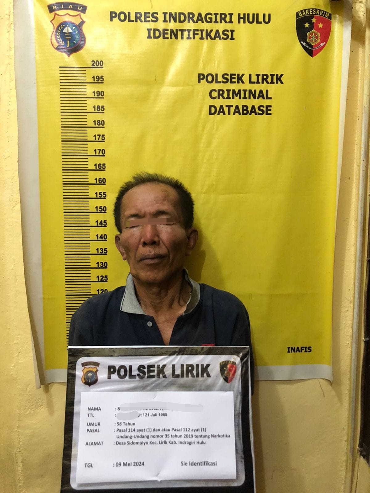 Kemudian, SK alias Keni (59) warga Desa Sidomulyo, Kecamatan Lirik diringkus unit y Polsek Lirik, Kamis 9 Mei 2024 malam, dirumahnya, pukul 19.30 WIB. Dari tangannya, diamankan 1 paket sabu-sabu dengan berat kotor 0,19 gram.