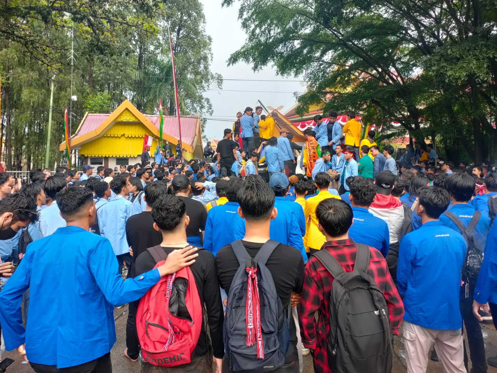 Massa yang datang dari mahasiswa Universitas Riau (UNRI), Universitas Lancang Kuning (UNILAK), Universitas Islam Riau (UIR) dan massa HMI menggeruduk gerbang DPRD Riau dan disambut barikade keamanan polisi Polresta Pekanbaru di bantu Polda Riau.