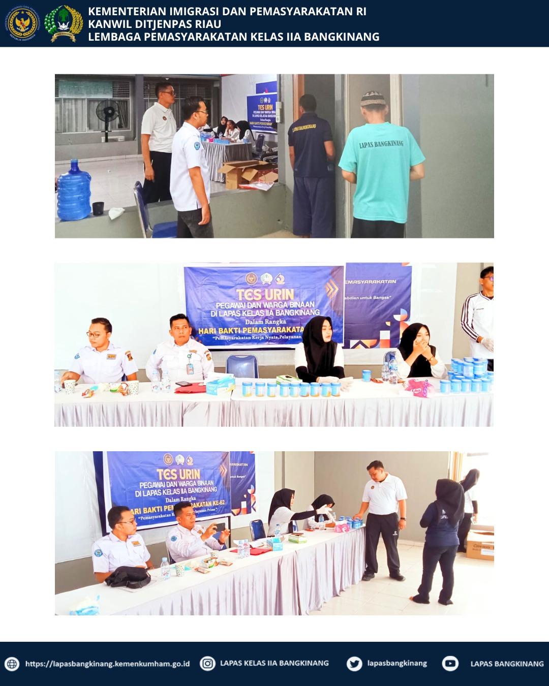 Pada siang hari, Lapas Bangkinang terlebih dahulu melaksanakan tes urine yang bekerja sama dengan BNK Kampar. Tes ini diikuti oleh seluruh petugas, peserta magang, serta warga binaan. Pelaksanaan tes urine dilakukan secara tertib, akuntabel, dan transparan guna memastikan tidak adanya penyalahgunaan narkotika di lingkungan pemasyarakatan.