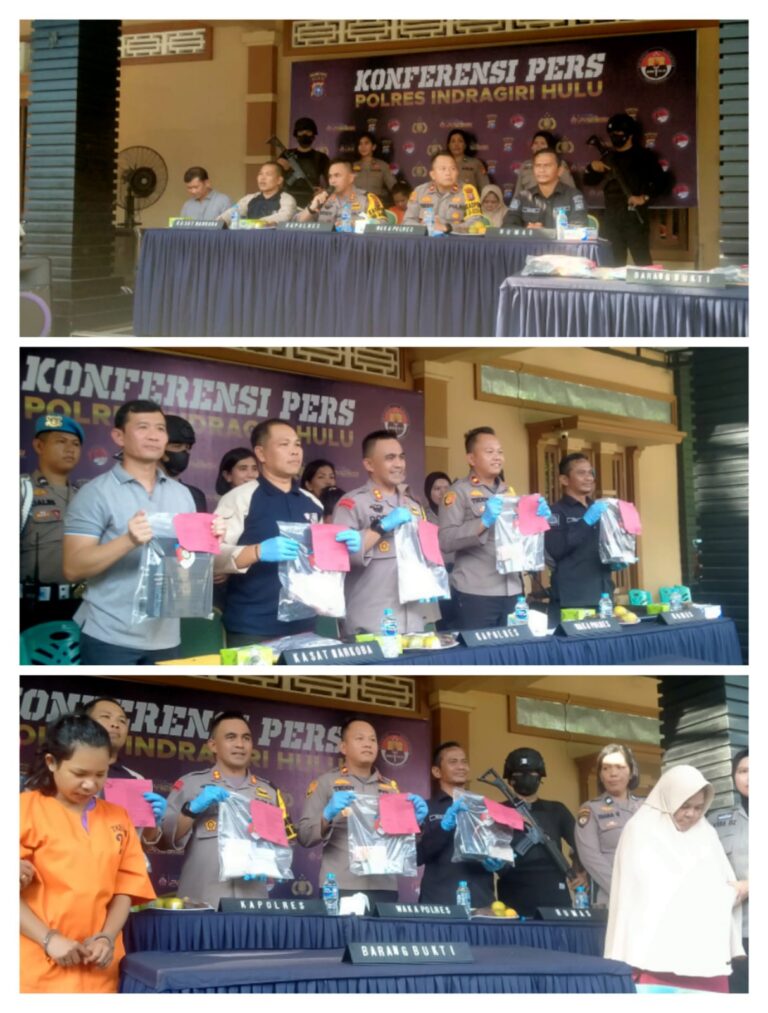 Turut mendampingi Kapolres dalam Konferensi Pers tersebut Wakapolres Inhu, Kompol Teddy Adrian SH, S.Ik, MH, Kasat Narkoba AKP Adam Efendy SE, MH dan PS Kasubsi Penmas Aiptu Misran. (Ali)