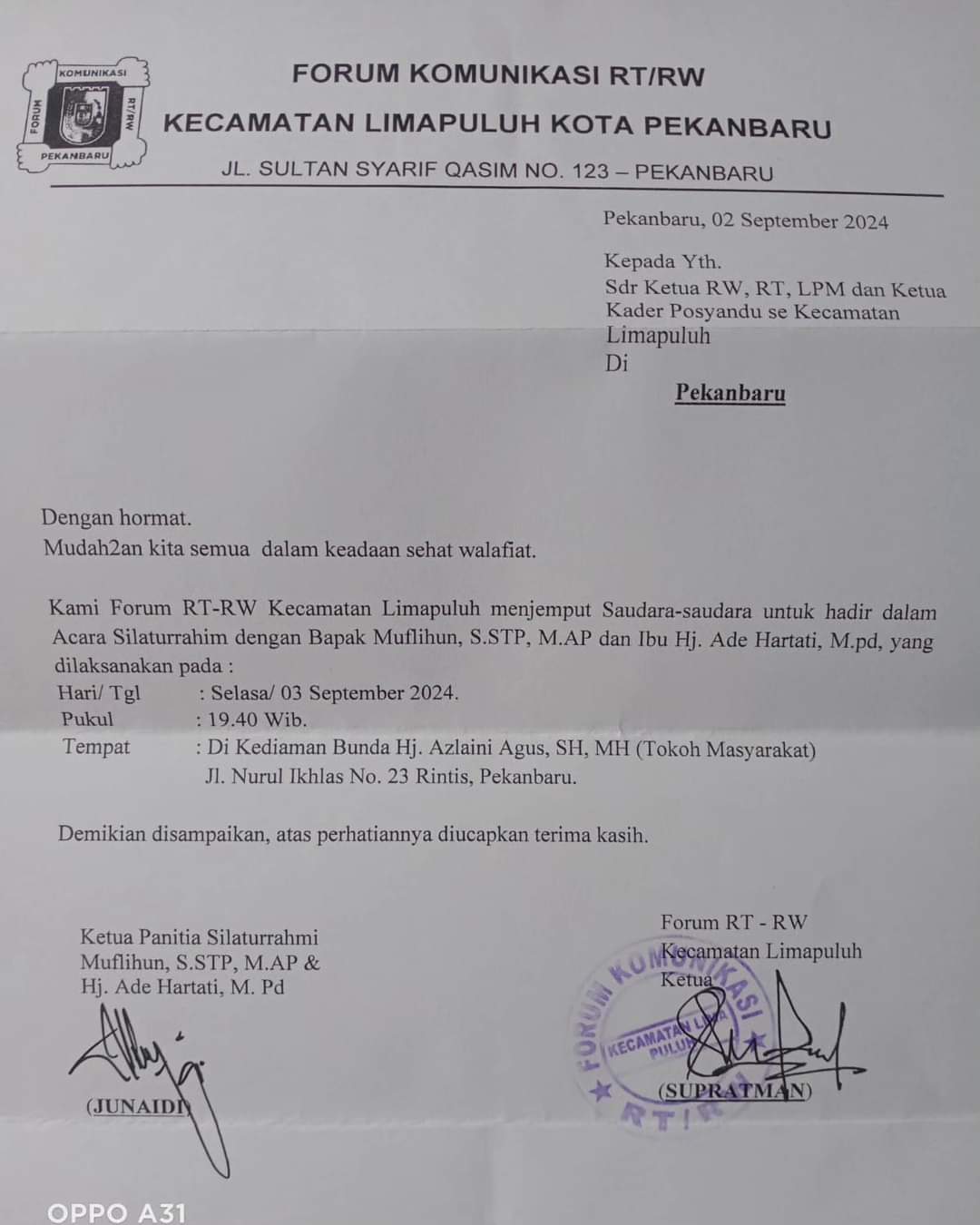 Dalam surat yang dibuat Senin (2/9) tersebut ditujukan kepada Ketua Panitia Silahturahmi Muflihun dan Ade Hartati, Junaidi dan Forum RT RW Kecamatan 50 Supratman.