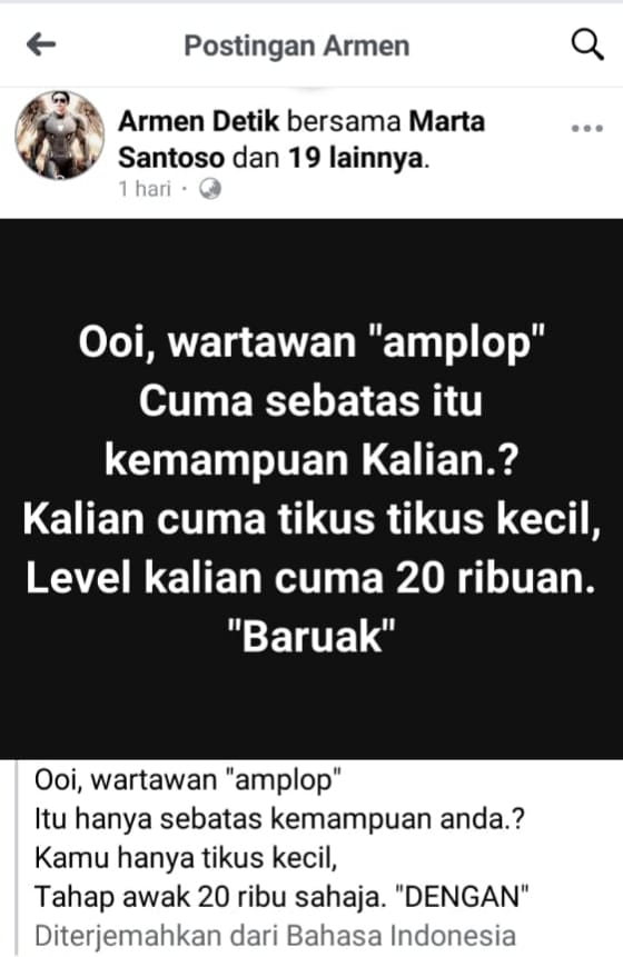 Pasalnya, munculnya pernyataan sikap Armen di Sosmed terkait usaha para pengusaha Cluide Palm Oil (CPO) di Wilayah Dumai, Provinsi Riau, Armen mengaku sebagai Pahlawan Back Up CPO, lalu menyebut profesi “kalian” (semua Wartawan_red) adalah Wartawan Amplop dan Wartawan dengan kelas jatah Rp 20.000 serta Tikus-Tikus kecil.